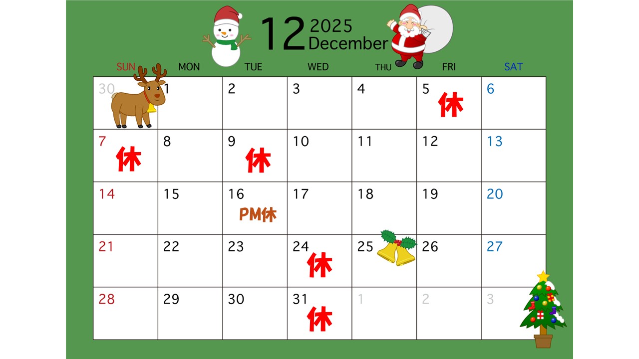 2025年11月30日 / 最終更新日時 : 2025年11月30日 TACHIKAWACHIHARU 12月の営業予定 ご予約状況によって変更することがございますので 直近の予定につきましてはホットペッパービューティーや Googleをご確認ください。 ご予約は「こちら」から(*^-^*)